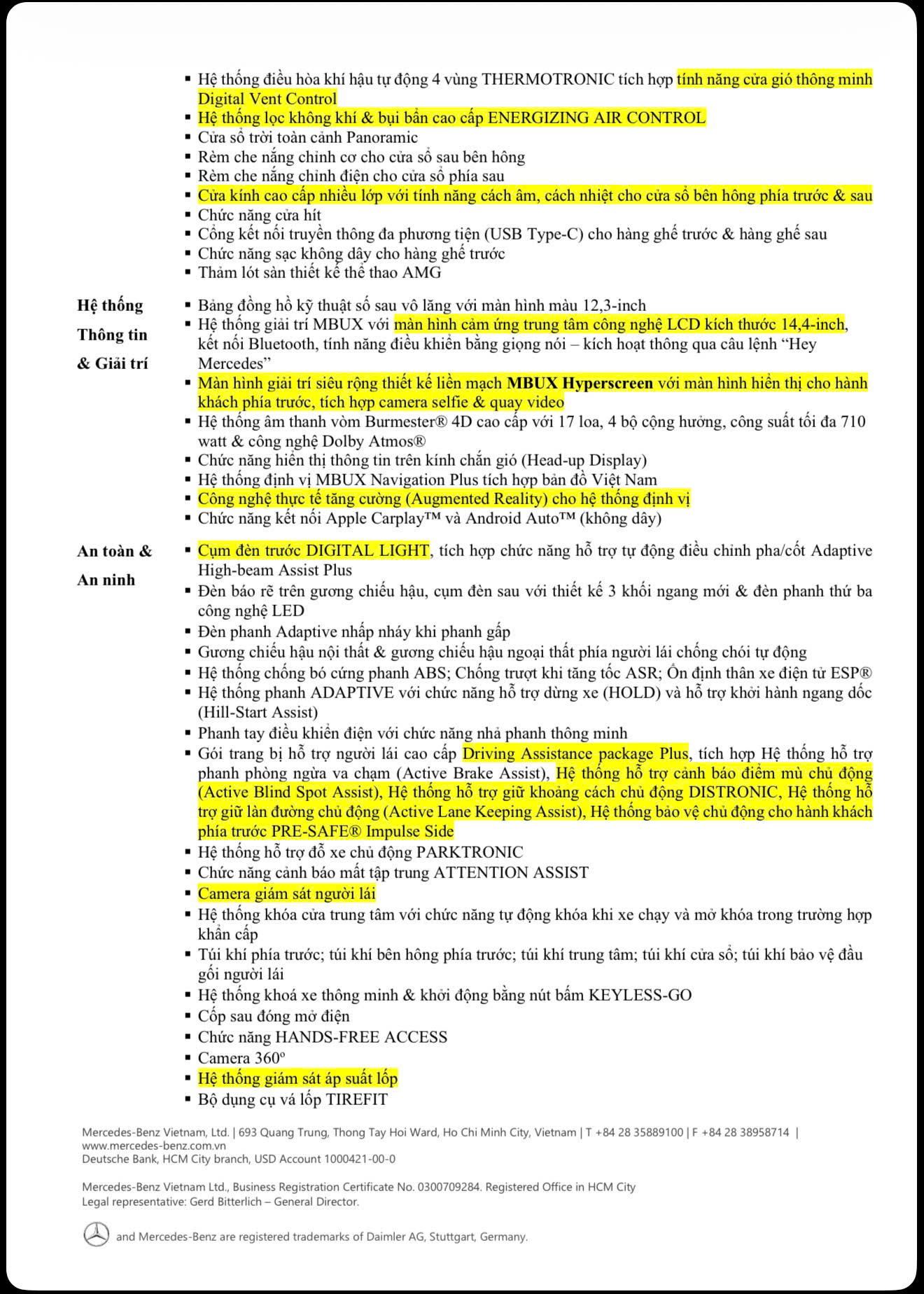 Màn hình MBUX Superscreen: thay thế thiết kế bảng táp-lô truyền thống, kéo dài từ vị trí trung tâm đến ghế phụ, tích hợp màn hình giải trí và hiển thị thông minh. Công nghệ MBUX thế hệ mới mang lại trải nghiệm trực quan, hỗ trợ kết nối không dây, cá nhân hóa giao diện và thao tác cảm ứng mượt mà.