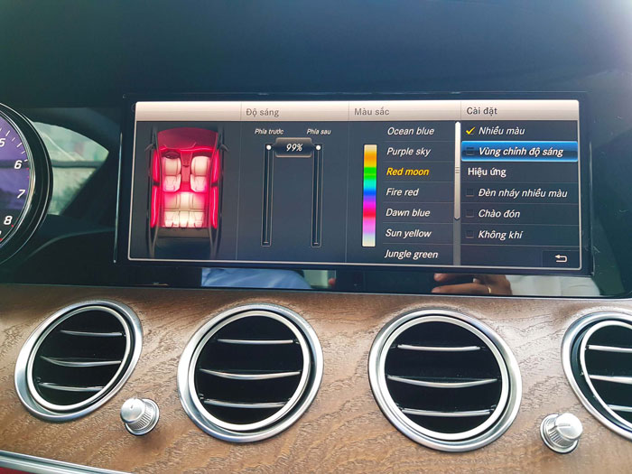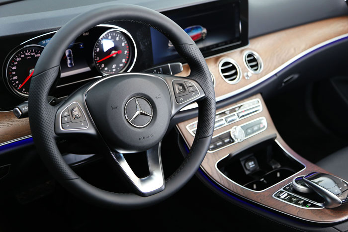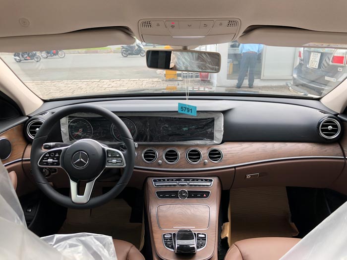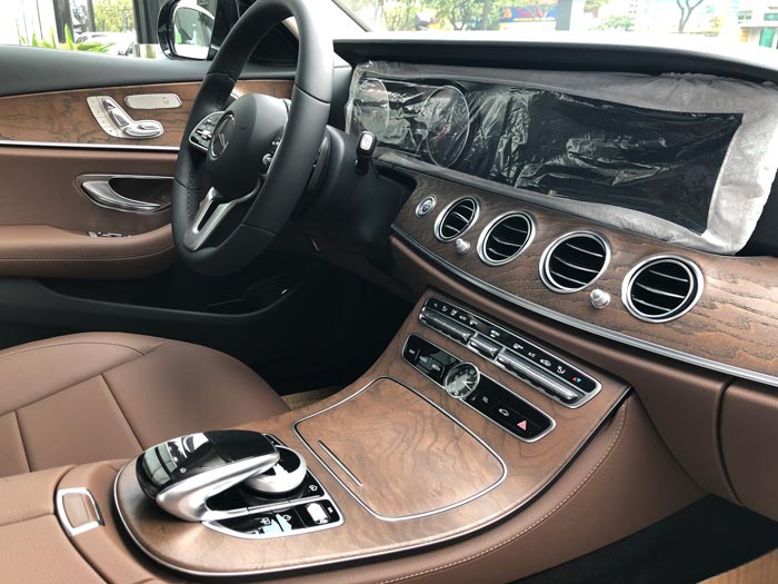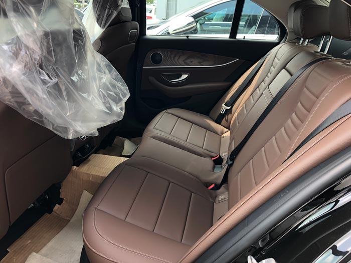 Xe Mercedes E 200 được trang bị nội thất ốp gỗ màu nâu kết hợp đèn viền nội thất có thể điều chỉnh với 64 tông màu riêng biệt và độ sáng khác nhau. Được trang bị bộ ghế da với 3 tùy chọn khác nhau: Đen, Nâu Hazenut, Vàng Machiato. Hàng ghế phía trước chỉnh điện với 3 vị trí nhớ ghế khác nhau.
