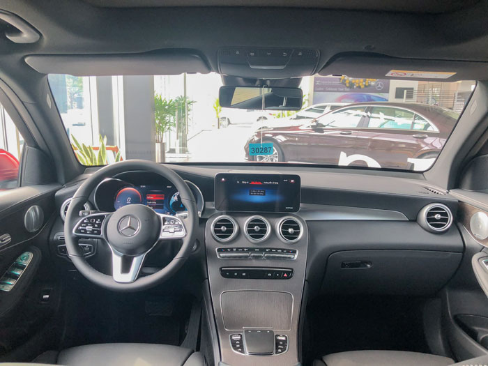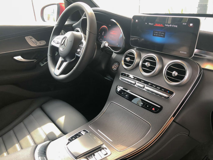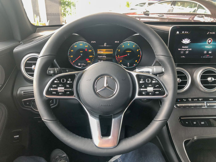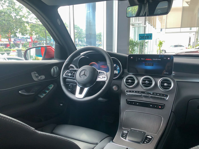 Điểm nổi bật trong đợt nâng cấp lần này chính là phần vô lăng. Vô lăng trên xe Mercedes GLC 300 thiết kế thể thao dạng ba chấu được bọc da nappa, phía dưới là cần sang số điện Direct-Select kết hợp với lẫy chuyển số. Tích hợp các nút điều khiển hệ thống, nghe gọi điện thoải, điều khiển hệ thống giải trí. Bảng đồng hồ điện tử với màn hình 12.5-inch hiển thị thông số kỹ thuật của xe khi vận hành. Ngoài ra một trang bị không thể thiếu có thể kể đến là chìa khóa thông minh và khởi động bằng nút bấm KEYLESS-GO. Chức năng kiểm soát tốc độ Cruise Control với giới hạn tốc độ SPEED-TRONIC.