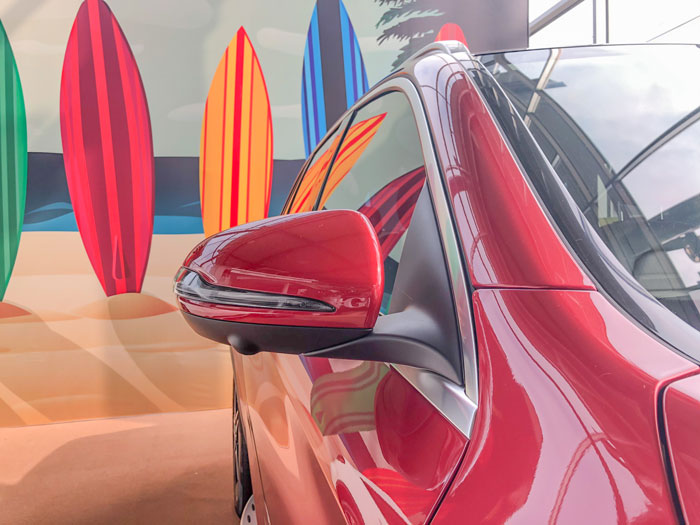 Gương chiếu hậu chỉnh điện, gập điện tích hợp đèn xi nhan báo rẽ. Phía dưới gương chiếu hậu là camera cặp hông nằm trong cụm camera 360.
