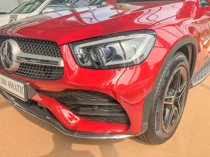 Thiết kế phần đầu xe ấn tượng mạnh mẽ với lưới tản nhiệt tạo hình kim cương 1 nan với logo ngôi sao ba cánh chính giữa. Lưới tản nhiệt trông rất hầm hố tạo thêm phần cá tính cho chiếc xe. Cụm đèn pha chiếu sáng thiết kế vuốt ngược ra phía sau rất phong cách. Nếu như phiên bản tiền nhiệm chỉ được sử dụng hệ thống đèn thông minh ILS thì với phiên bản nâng cấp này, xe Mercedes GLC 300 4MATIC đã được trang bị công nghệ Multibeam-LED thông minh có thể tự điều chỉnh góc chiếu.