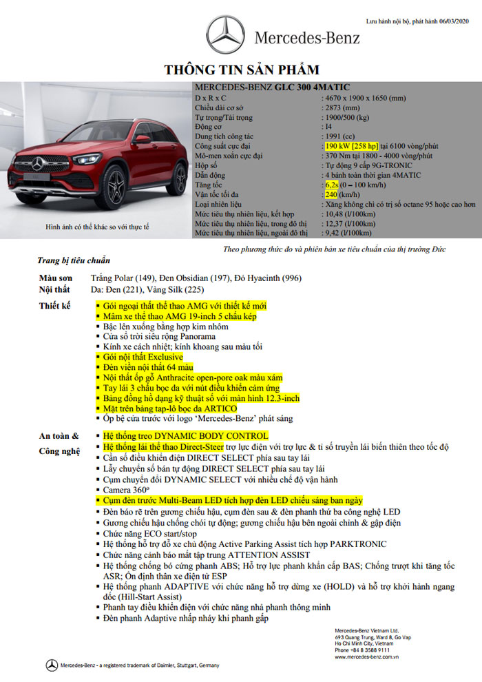 Sau khi giới thiệu xe Mercedes GLC 200 và xe Mercedes GLC 200 4MATIC vào những ngày đầu tháng 2/2020, MBV tiếp tục ra mắt phiên bản còn lại của dòng GLC là xe Mercedes GLC 300 4MATIC. Theo đó, GLC 300 4Matic sẽ có giá 2,399 tỷ đồng, lắp ráp trong nước.